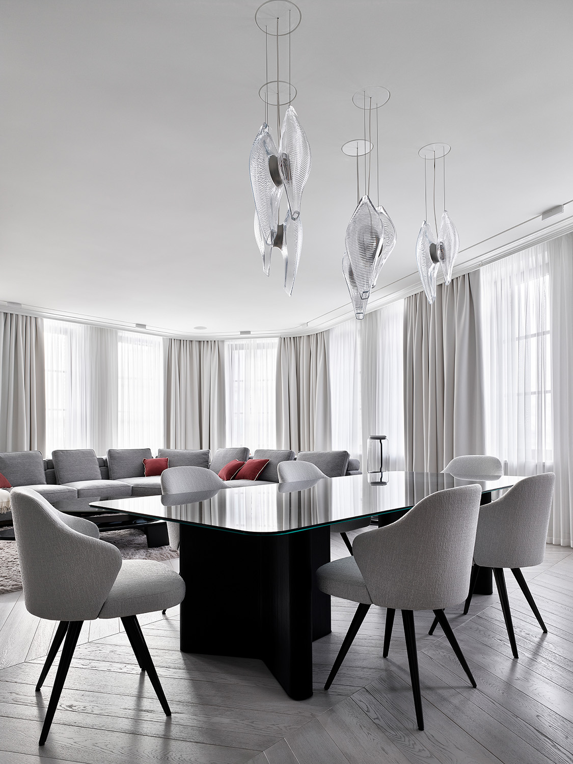 Главным акцентом гостиной является кухонный остров из натурального мрамора Palissandro — этот уникальный, сложный в изготовлении, элемент интерьера был выполнен на заказ. Формообразование острова было вдохновлено волнообразными элементами мебели столовой зоны, а именно подстольем обеденного стола. Применение натурального камня позволяет оживить монохромный интерьер, так как естественный рисунок мрамора добавляет интерьеру выразительности и контраста. Все применённые материалы перетекают из одного помещения в другое, объединяя квартиру в единое целое.