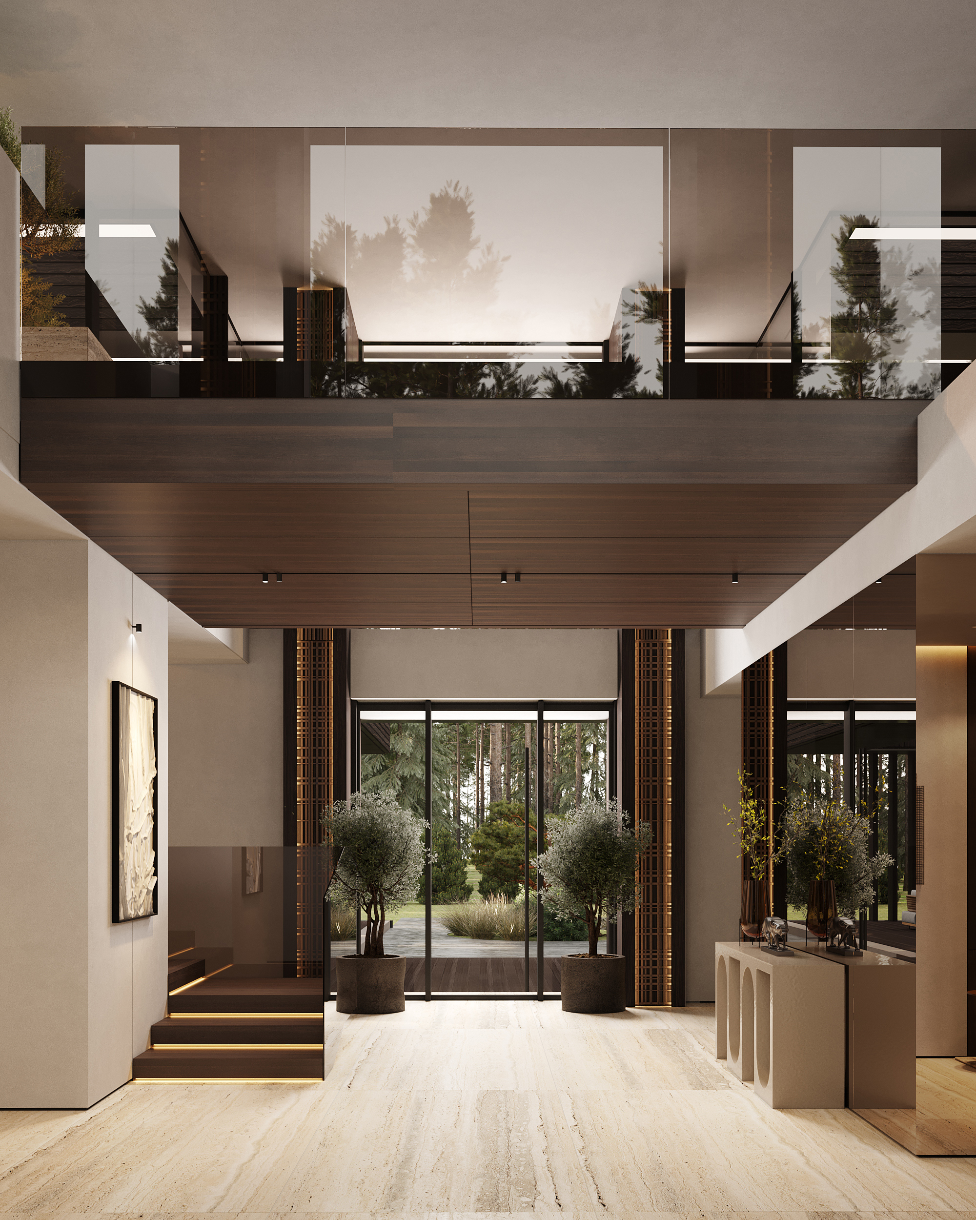 Сердцем дома, объединяющим все пространства, является центральный блок, включающий лестницу, ведущую к мосту, и кухню. Этот объем, отделанный шпоном, представляет собой своего рода ядро резиденции, где располагается просторная кухня с большим островом – идеальное место для семейных встреч и кулинарных экспериментов. Цветовая гамма интерьера выдержана в теплых тонах: бежевый травертин гармонично сочетается с коньячными оттенками мягкой мебели и шоколадным цветом дуба, создавая атмосферу тепла.