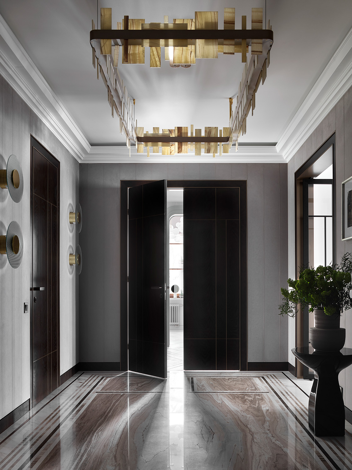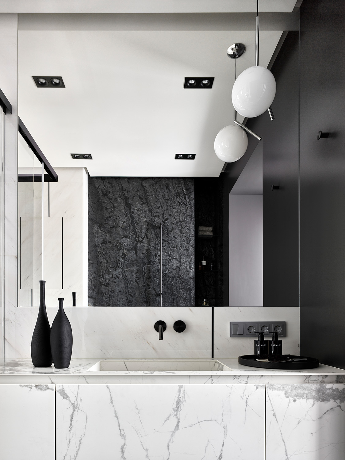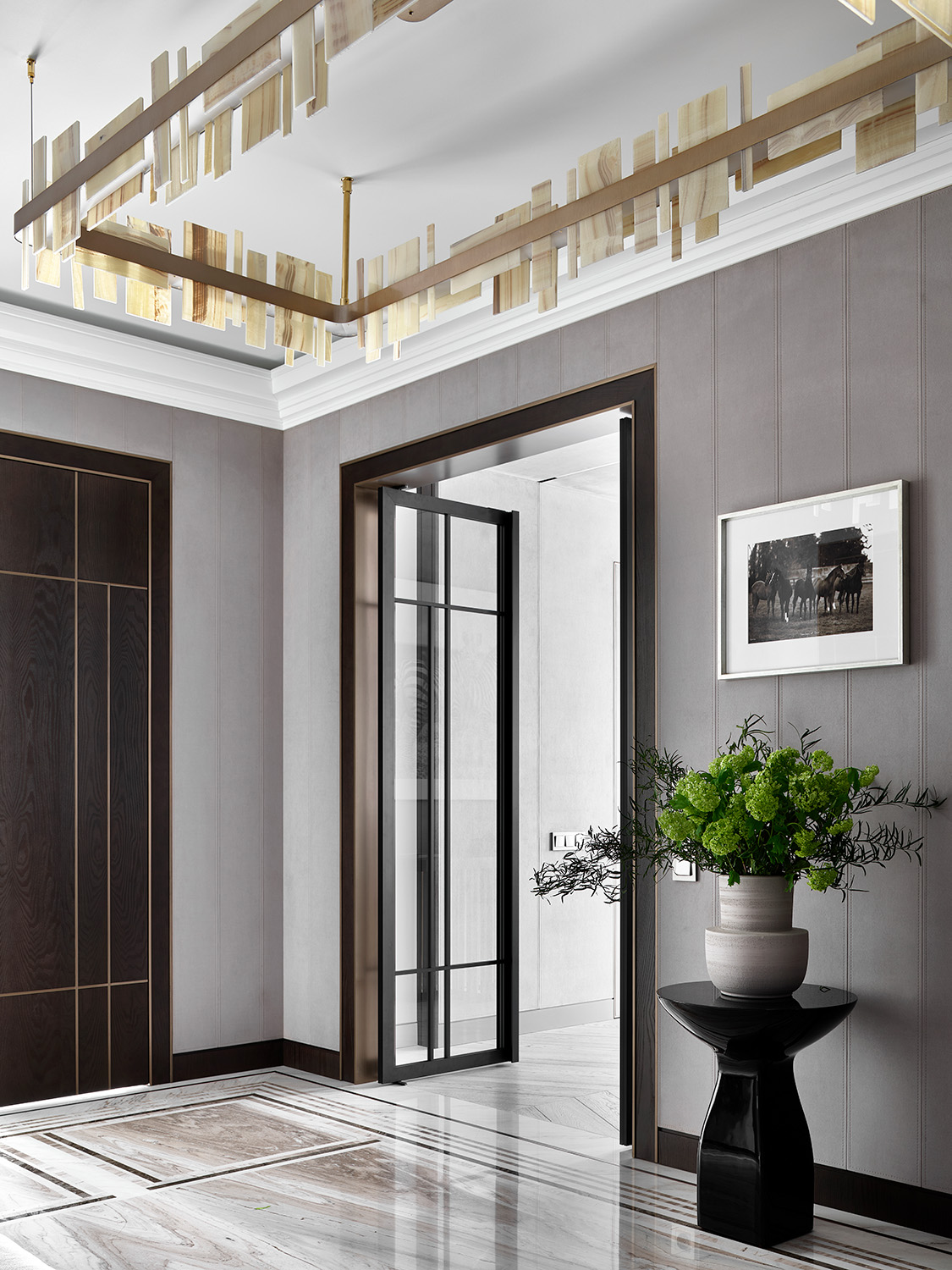 Монохромный колорит квартиры служит нейтральным фоном для сочетания разных отделочных материалов: панели из алькантары и шпона, металл и нубук, натуральный камень и стекло. Весь интерьер построен на сочетании разнообразных фактур.
