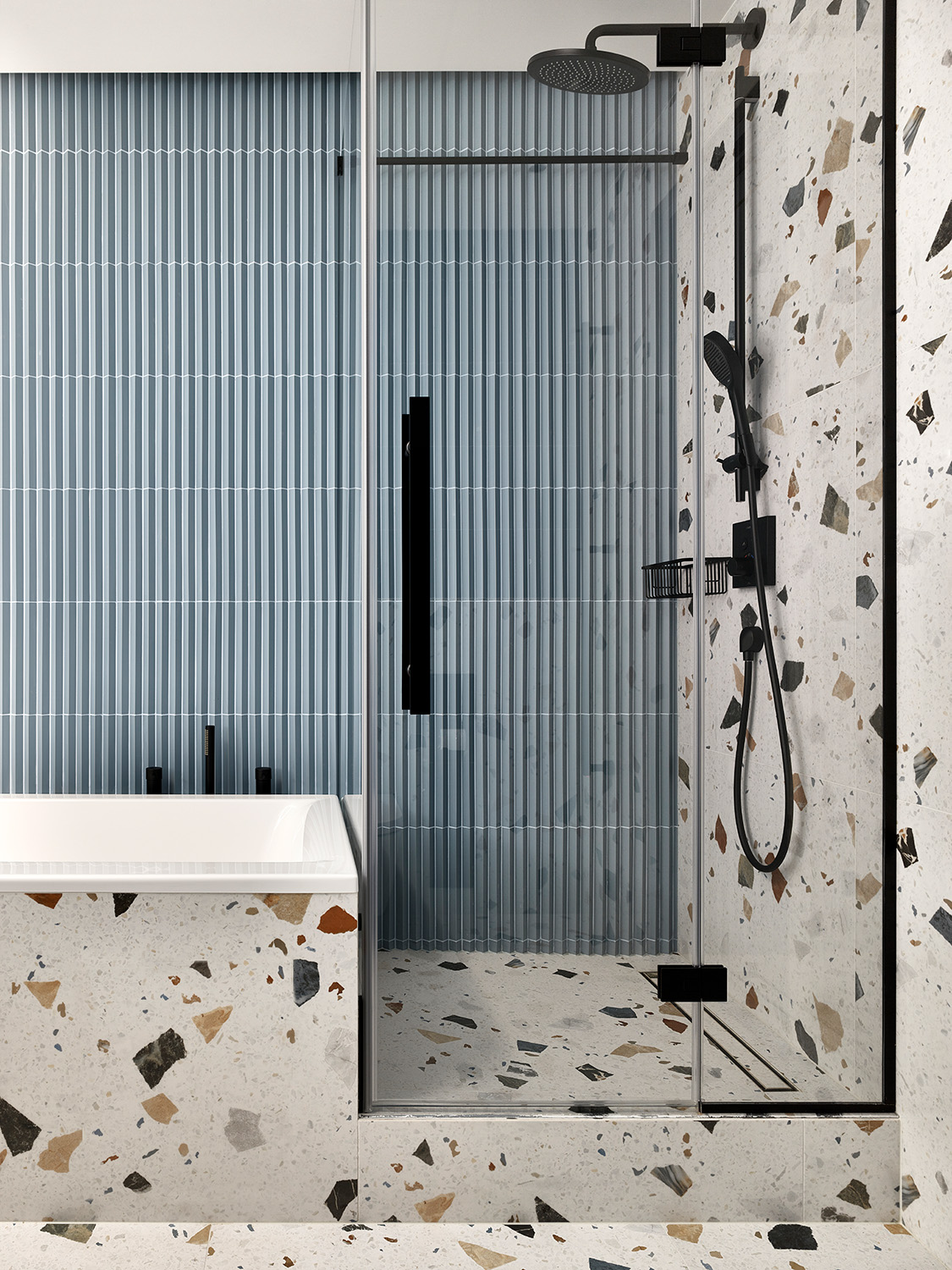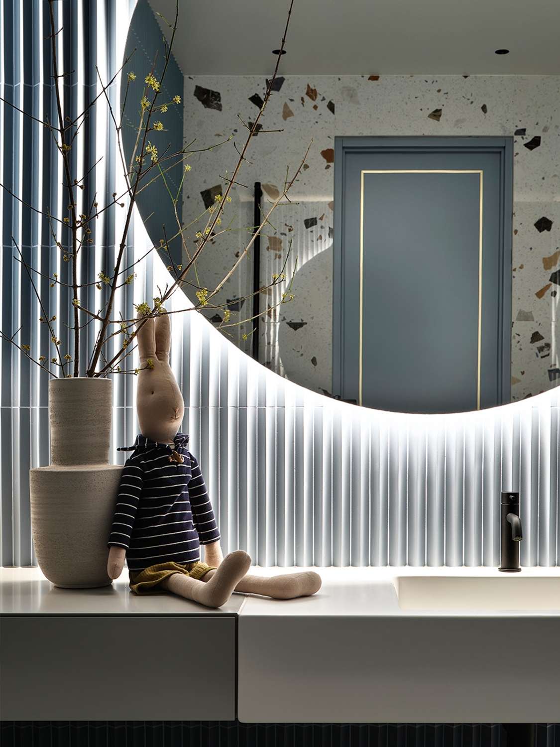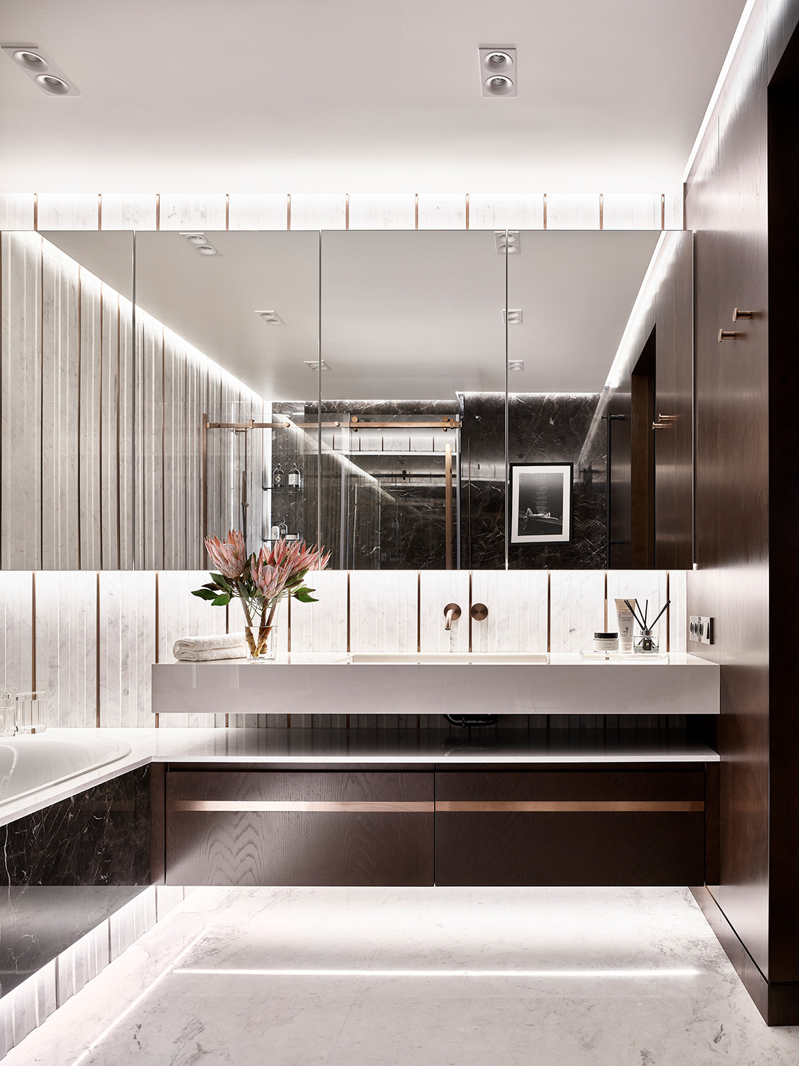 Монохромный колорит квартиры служит нейтральным фоном для сочетания разных отделочных материалов: панели из алькантары и шпона, металл и нубук, натуральный камень и стекло. Весь интерьер построен на сочетании разнообразных фактур.