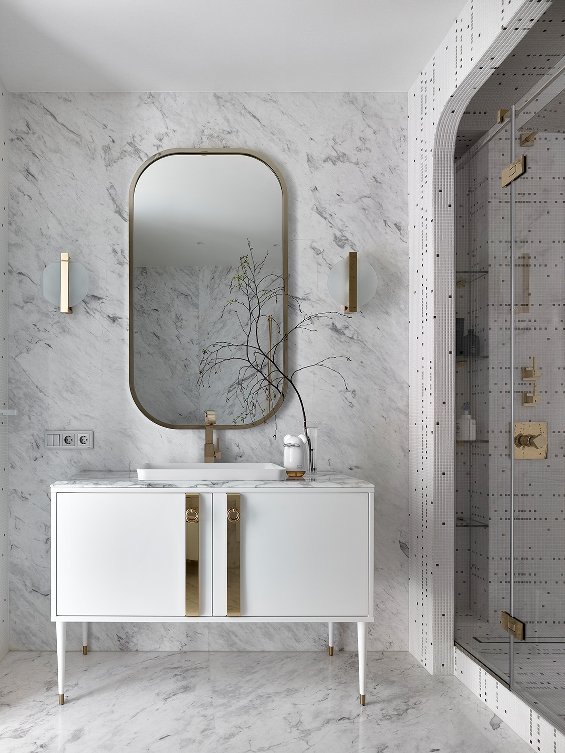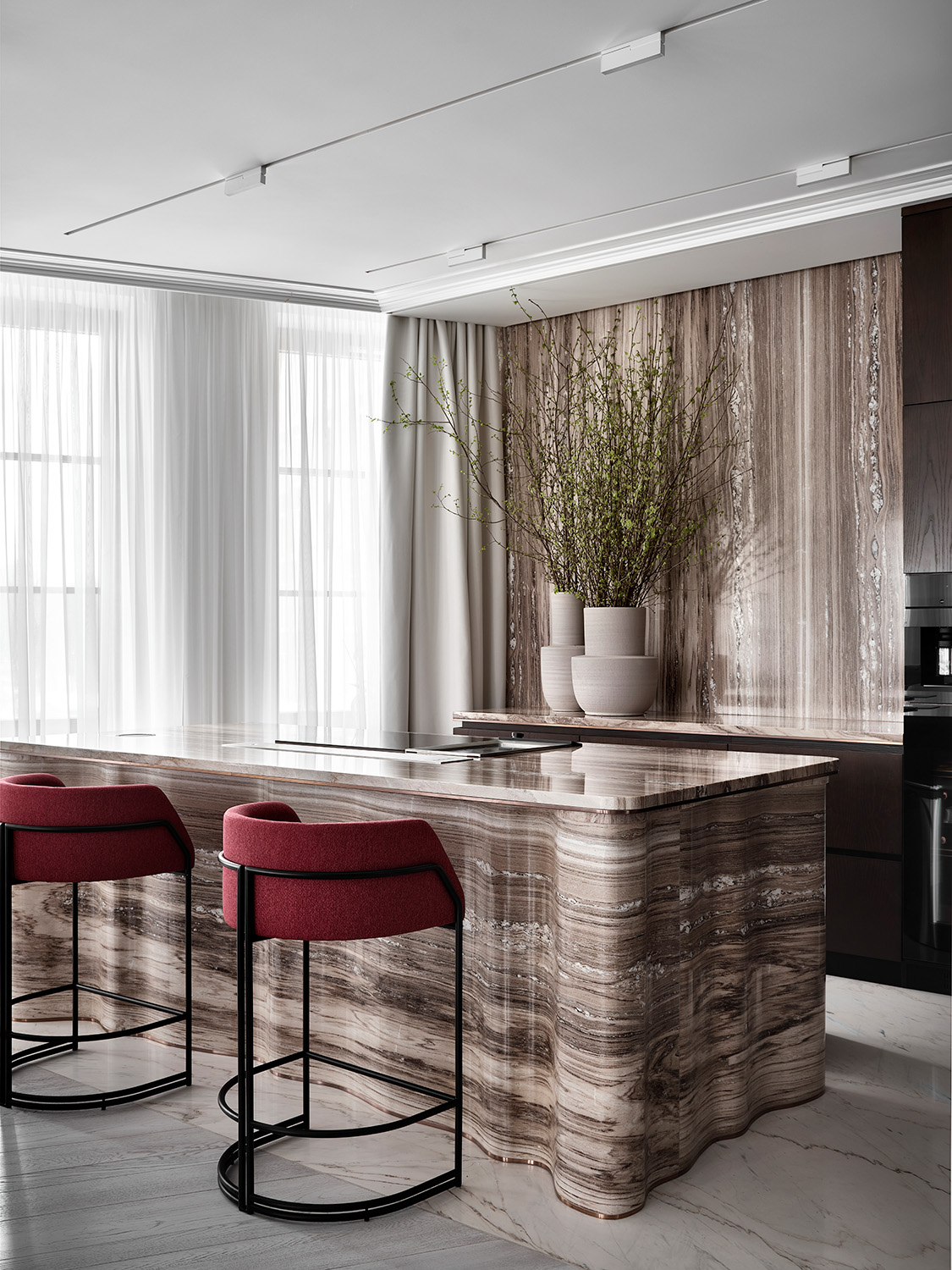 Главным акцентом гостиной является кухонный остров из натурального мрамора Palissandro — этот уникальный, сложный в изготовлении, элемент интерьера был выполнен на заказ. Формообразование острова было вдохновлено волнообразными элементами мебели столовой зоны, а именно подстольем обеденного стола. Применение натурального камня позволяет оживить монохромный интерьер, так как естественный рисунок мрамора добавляет интерьеру выразительности и контраста. Все применённые материалы перетекают из одного помещения в другое, объединяя квартиру в единое целое.
