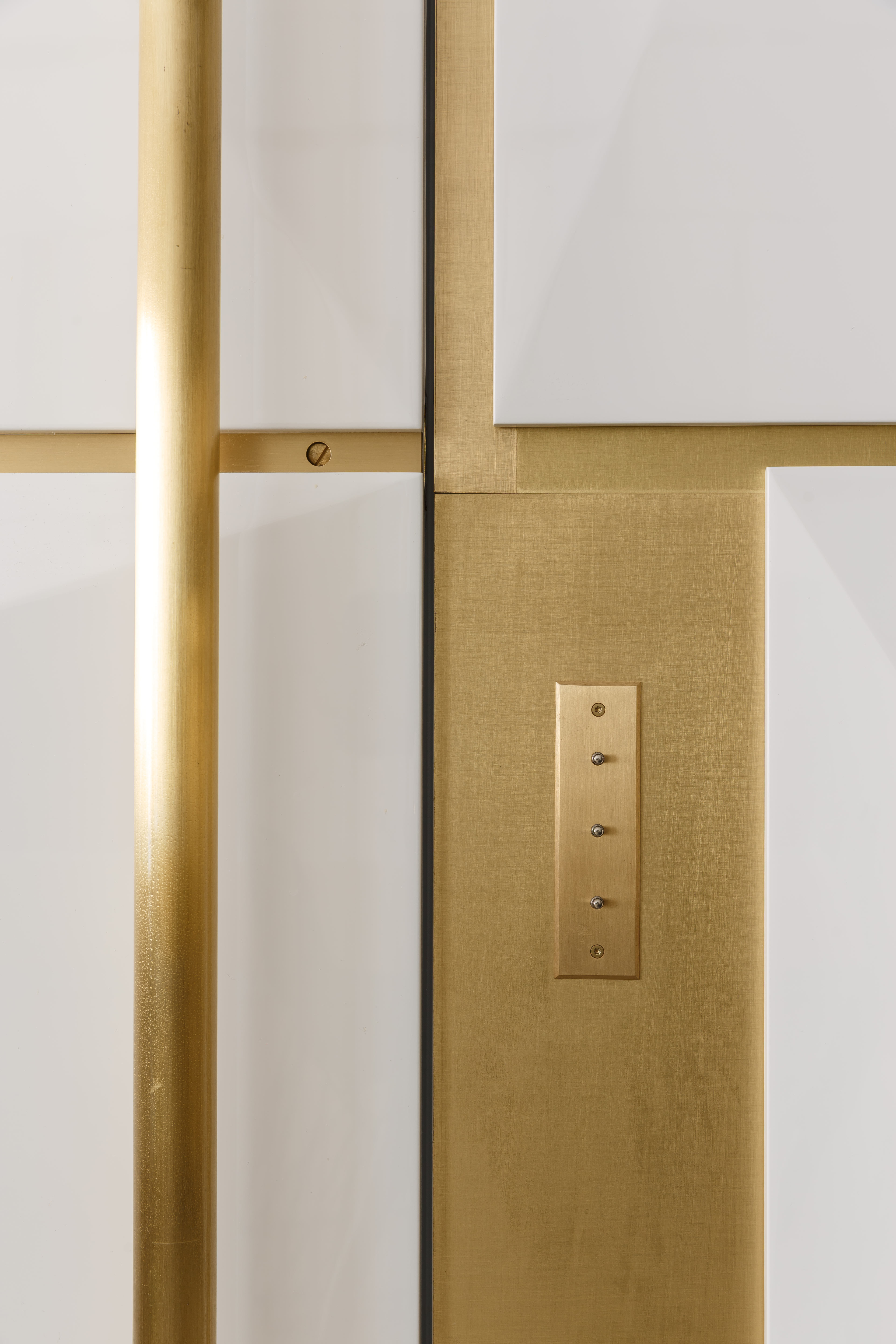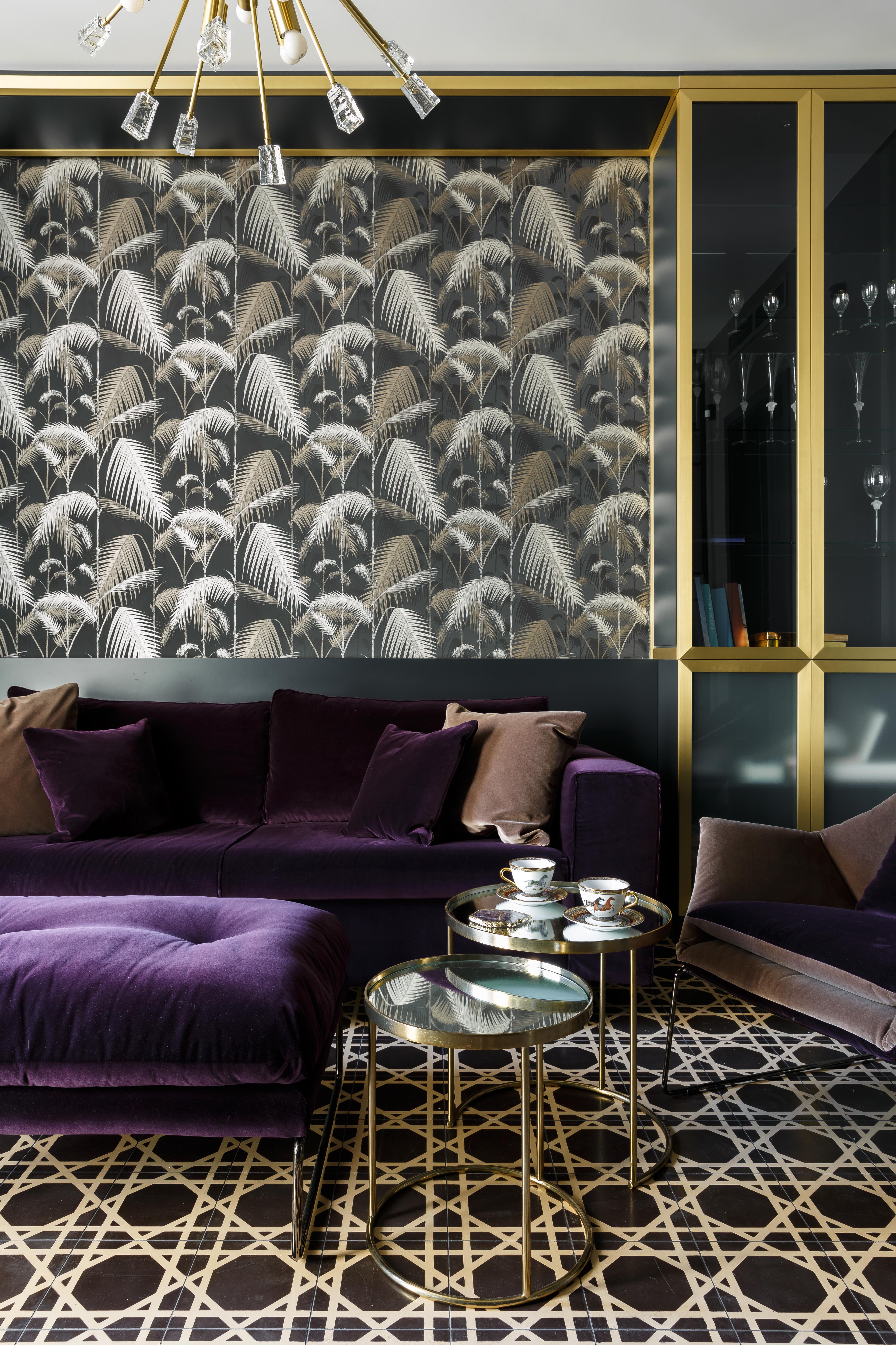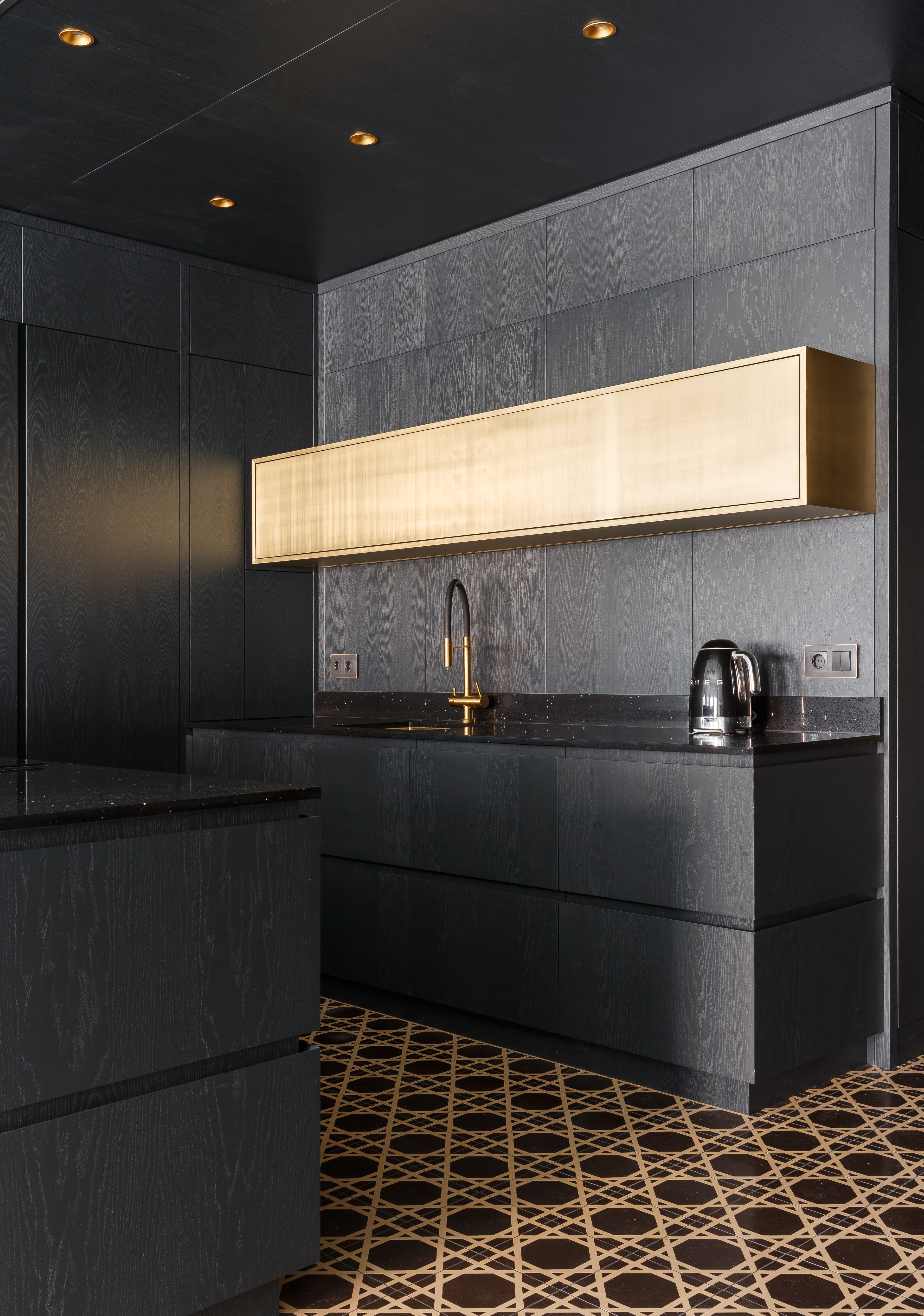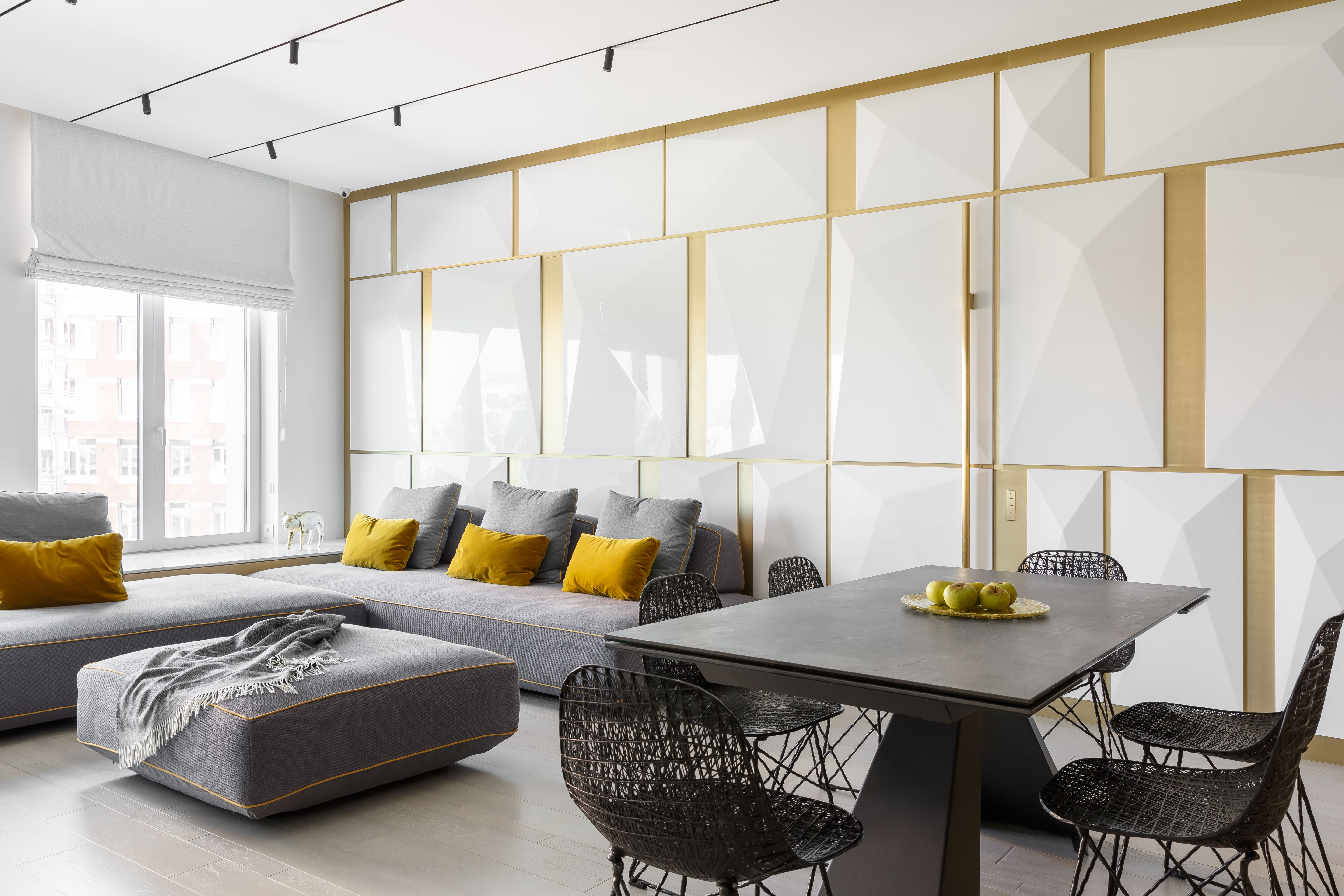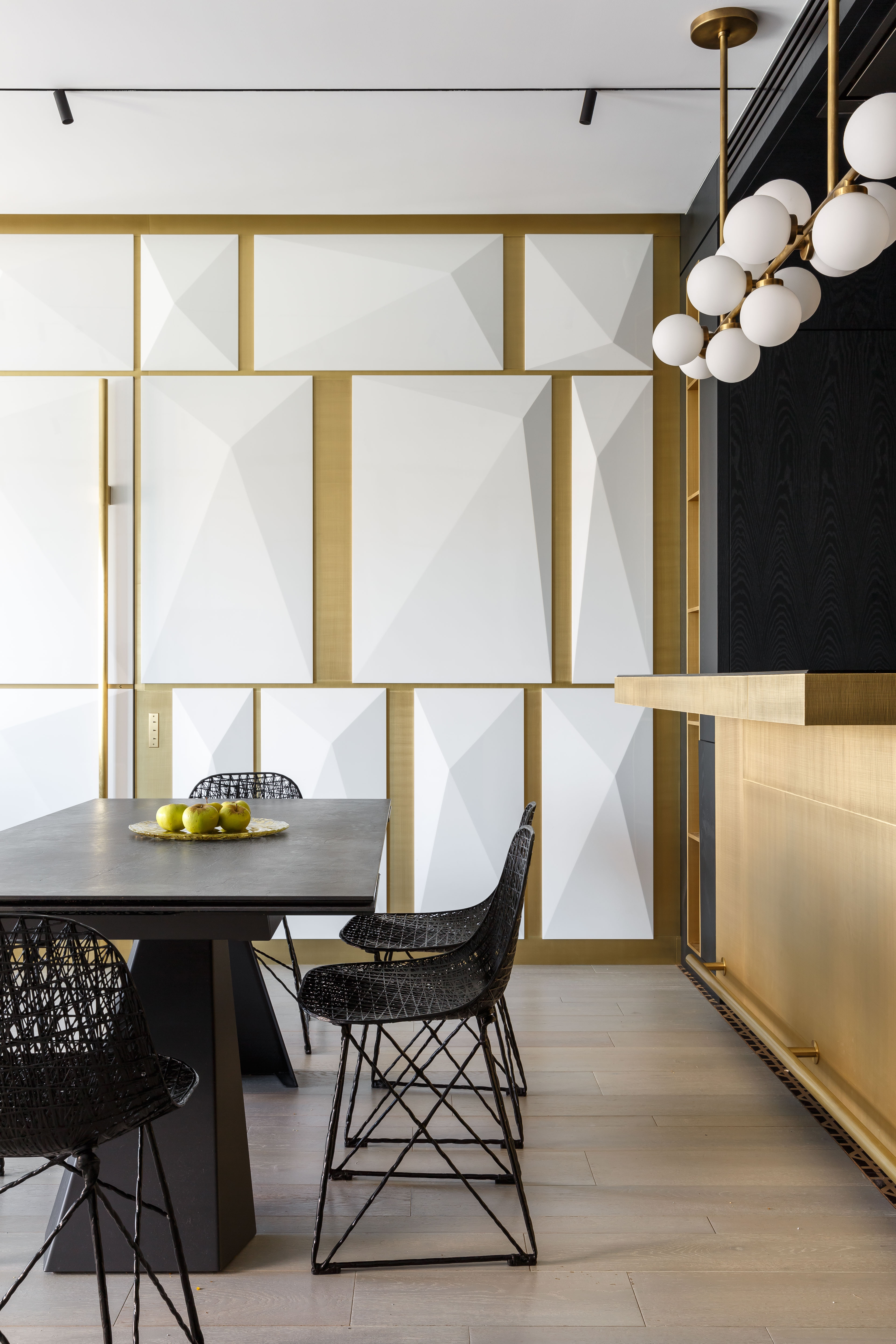Гостиная, кухня и холл образуют единое пространство, разделенное по функциям с помощью цветового приема – чередования черного и белого. Входная дверь и двери в приватные помещения интегрированы в единую систему шпонированных панелей и систем хранения. В таком же стиле и отделке выполнена кухня. Темный цвет буазери на стенах и потолке создает цельное и обволакивающее пространство, на фоне которого эффектно выделяются граненые панели белого цвета с латунными вставками. Образ в целом современный, выразительный и исполнен торжественных нот.