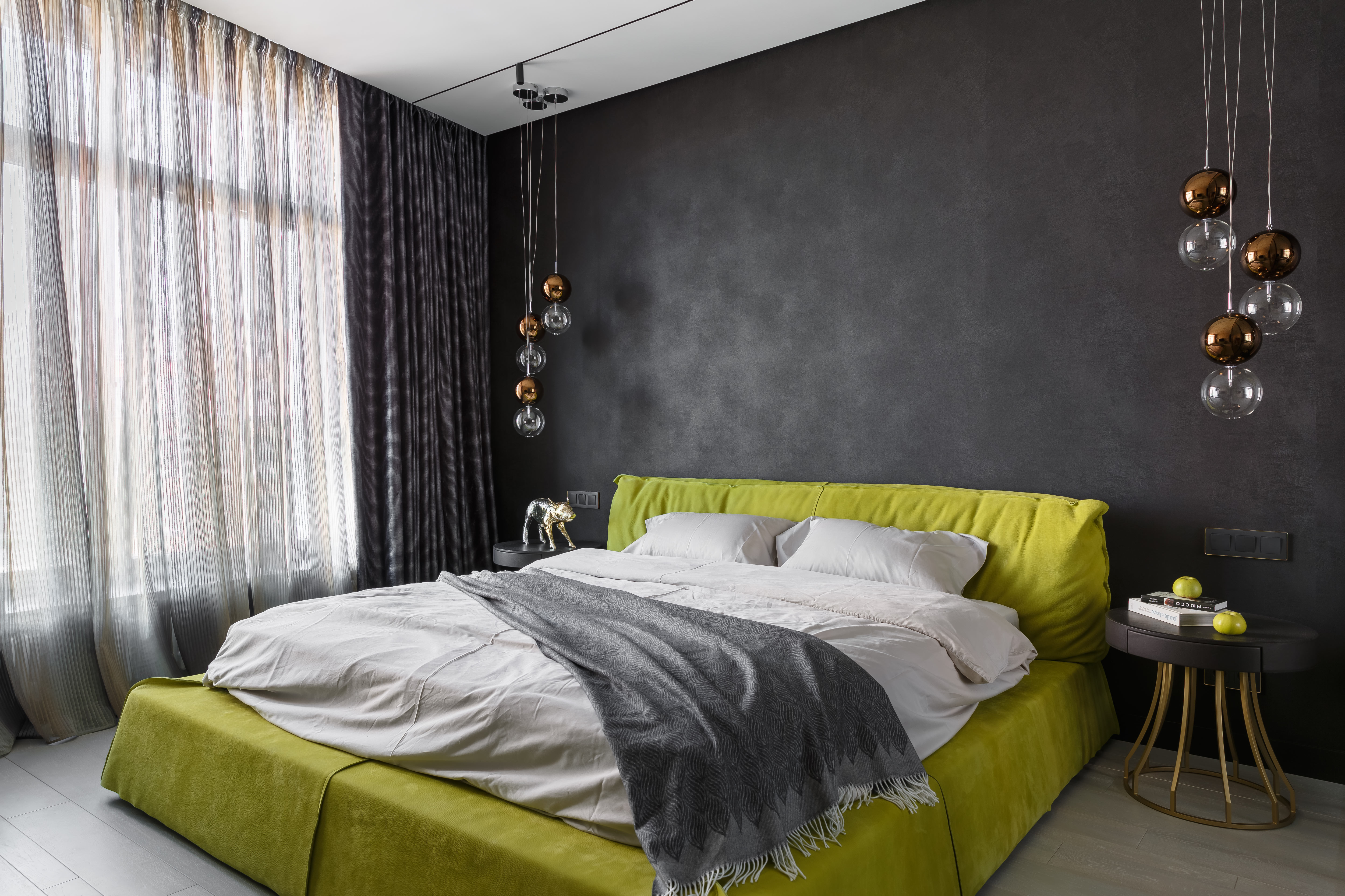 Мастер-блок включает в себя спальню с гардеробной, скрытой за затемненным стеклом, и отдельную ванную комнату. В оформлении использованы оттенки зеленого: кровать фисташкового оттенка в спальне, мебель для ванной и стена из оникса оливково-зеленого цвета Jade Green. Детская комната и прилегающий санузел, подобно родительскому блоку, выдержаны в единой цветовой гамме, построенной на оттенках белого и василькового.