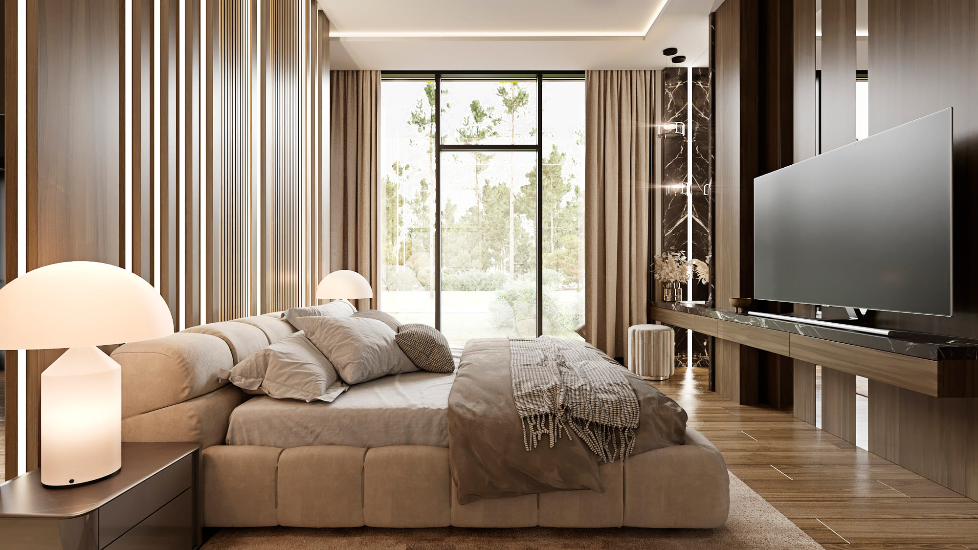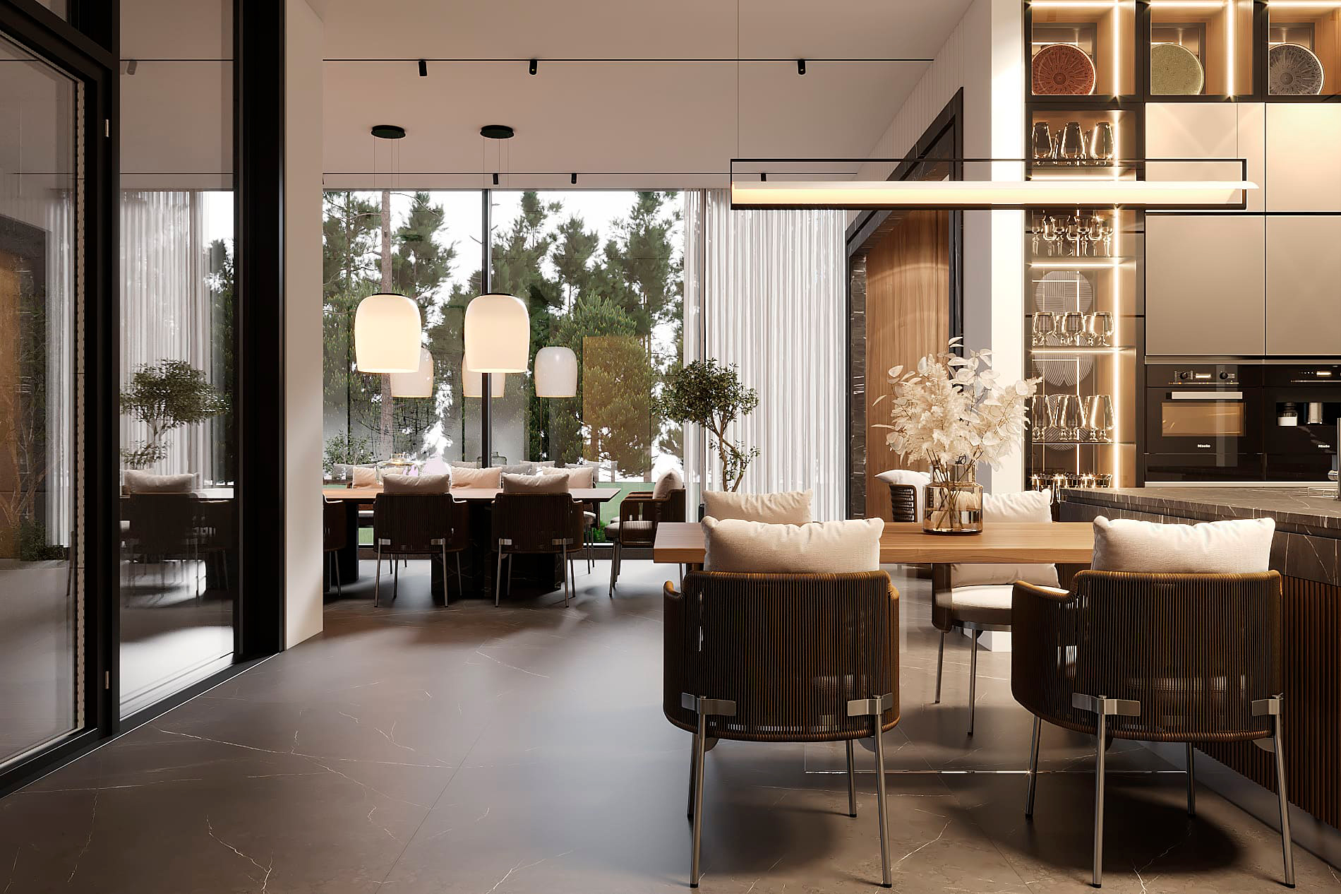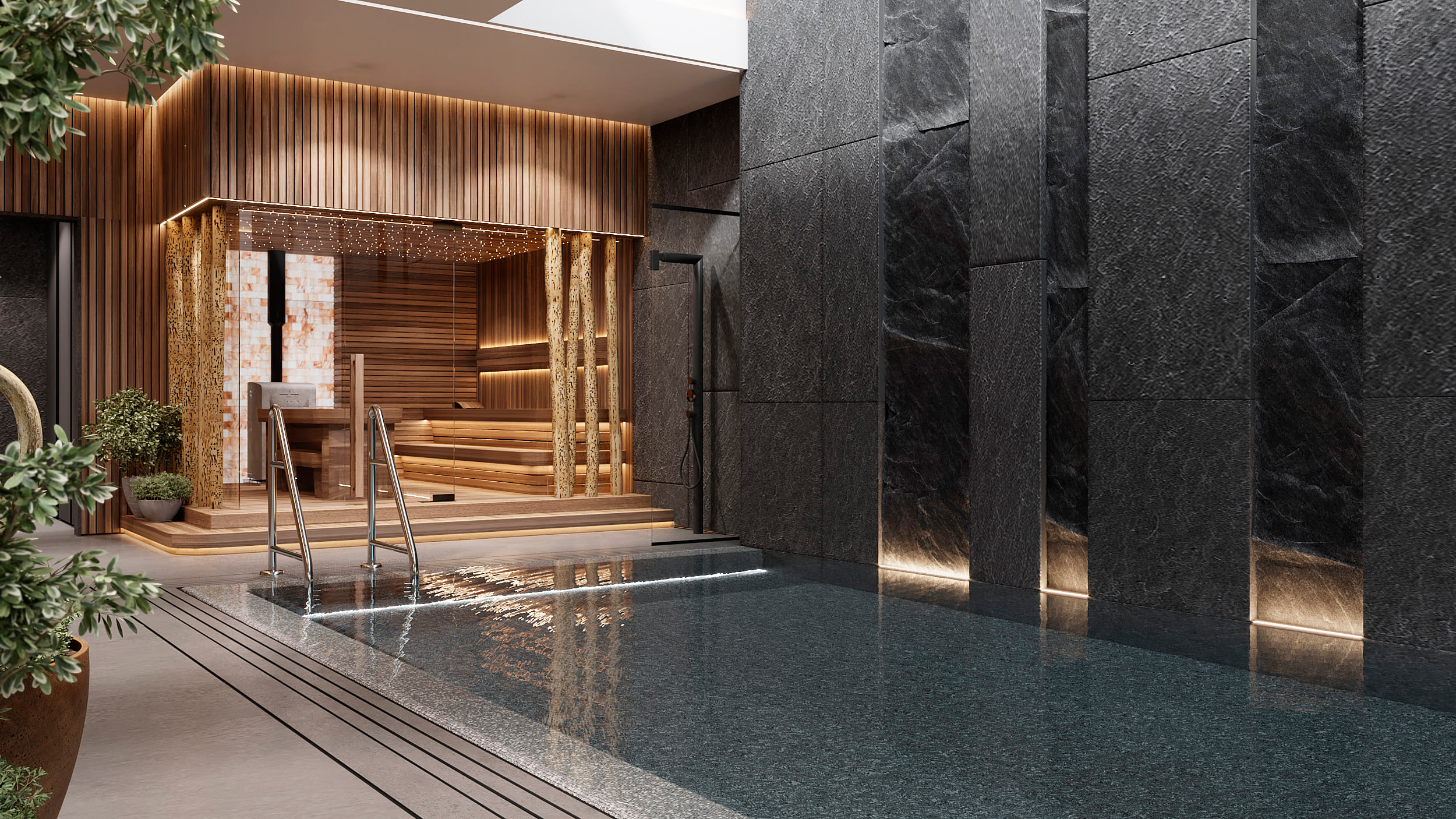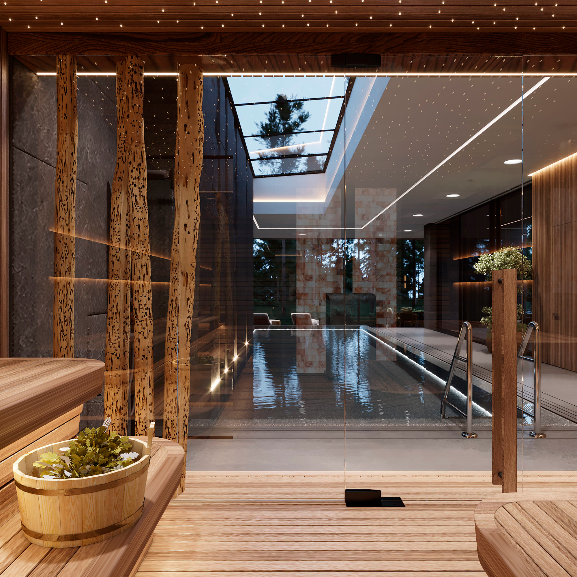 Функциональное зонирование дома подчинено принципу максимального комфорта. Сердцем планировки является внутренний озелененный двор, обеспечивающий визуальную и физическую связь с нетронутым лесным массивом. Все основные помещения первого этажа – мастер-блок, гостиная, кухня и столовая – спроектированы таким образом, чтобы обеспечить непосредственный доступ во внутренний двор. Это позволяет в любой момент выйти на свежий воздух, ощутить аромат трав и насладиться тишиной природы. Зона спа также имеет выход во дворик, предлагая возможность для уединенных солнечных ванн. Весь второй этаж предназначен для детских мастер-блоков, обеспечивая им приватное и комфортное пространство для жизни и развития. Отделка фасада (планкен теплых оттенков и керамогранит) плавно переходит в спа-зону, визуально объединяя экстерьер и зону отдыха. Инфинити-бассейн с переливным краем создает эффект визуального слияния с окружающим лесным массивом. Резиденция в Охта Парке представляет собой уникальное пространство для жизни, где архитектура и природа образуют единое целое.