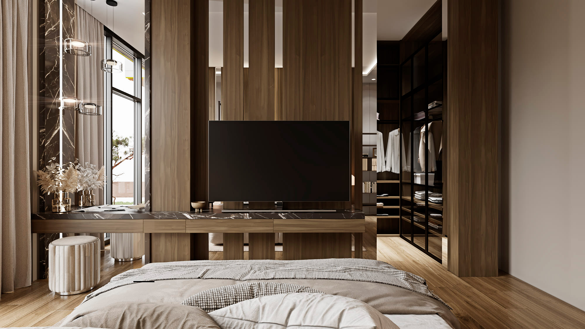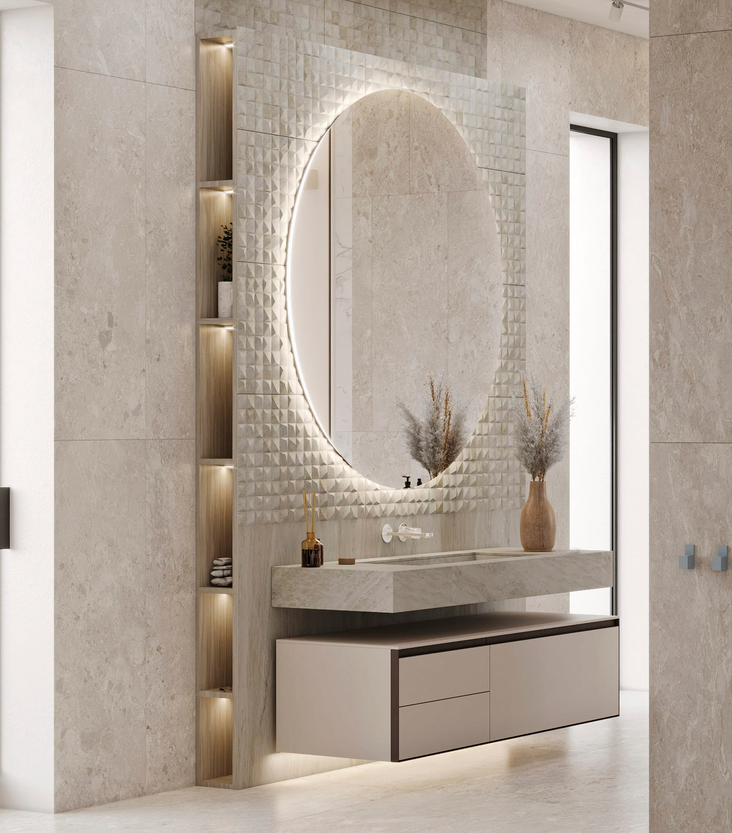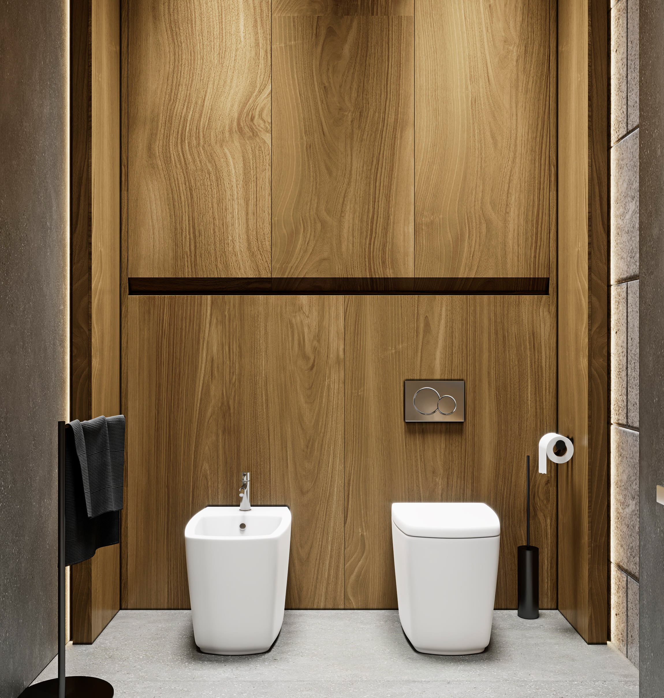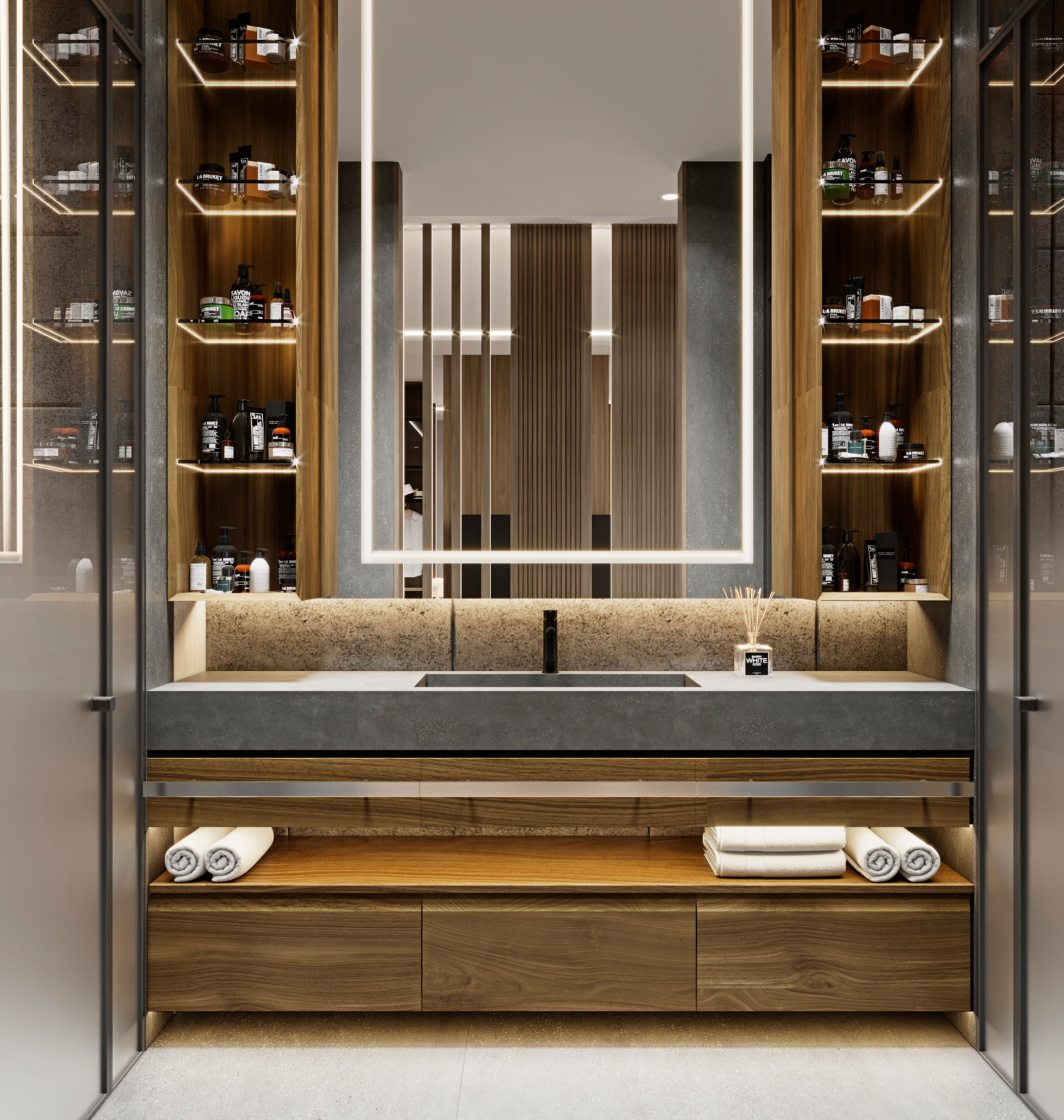 Функциональное зонирование дома подчинено принципу максимального комфорта. Сердцем планировки является внутренний озелененный двор, обеспечивающий визуальную и физическую связь с нетронутым лесным массивом. Все основные помещения первого этажа – мастер-блок, гостиная, кухня и столовая – спроектированы таким образом, чтобы обеспечить непосредственный доступ во внутренний двор. Это позволяет в любой момент выйти на свежий воздух, ощутить аромат трав и насладиться тишиной природы. Зона спа также имеет выход во дворик, предлагая возможность для уединенных солнечных ванн. Весь второй этаж предназначен для детских мастер-блоков, обеспечивая им приватное и комфортное пространство для жизни и развития. Отделка фасада (планкен теплых оттенков и керамогранит) плавно переходит в спа-зону, визуально объединяя экстерьер и зону отдыха. Инфинити-бассейн с переливным краем создает эффект визуального слияния с окружающим лесным массивом. Резиденция в Охта Парке представляет собой уникальное пространство для жизни, где архитектура и природа образуют единое целое.