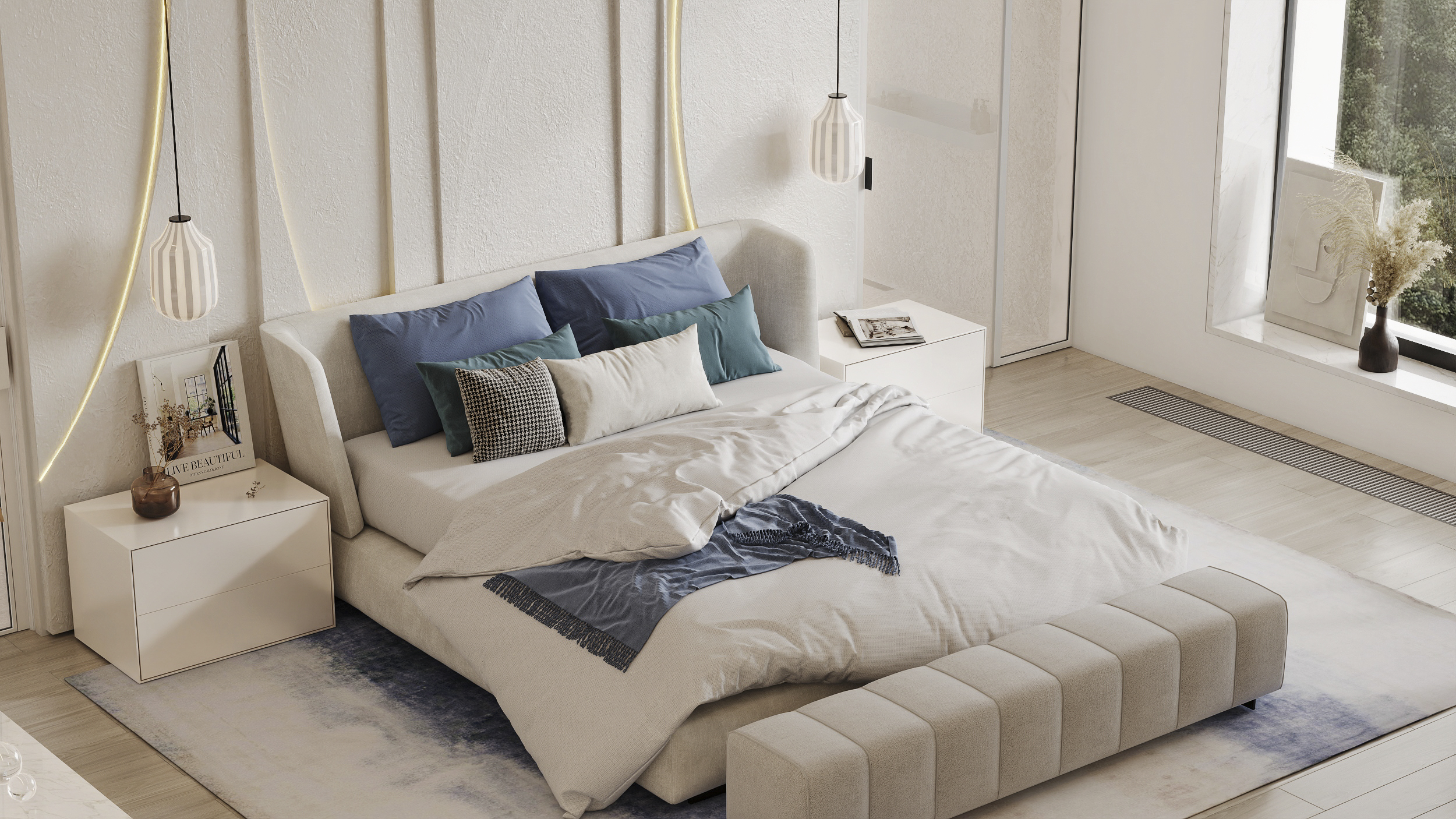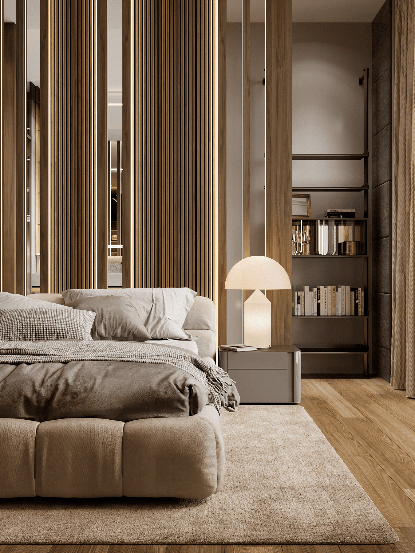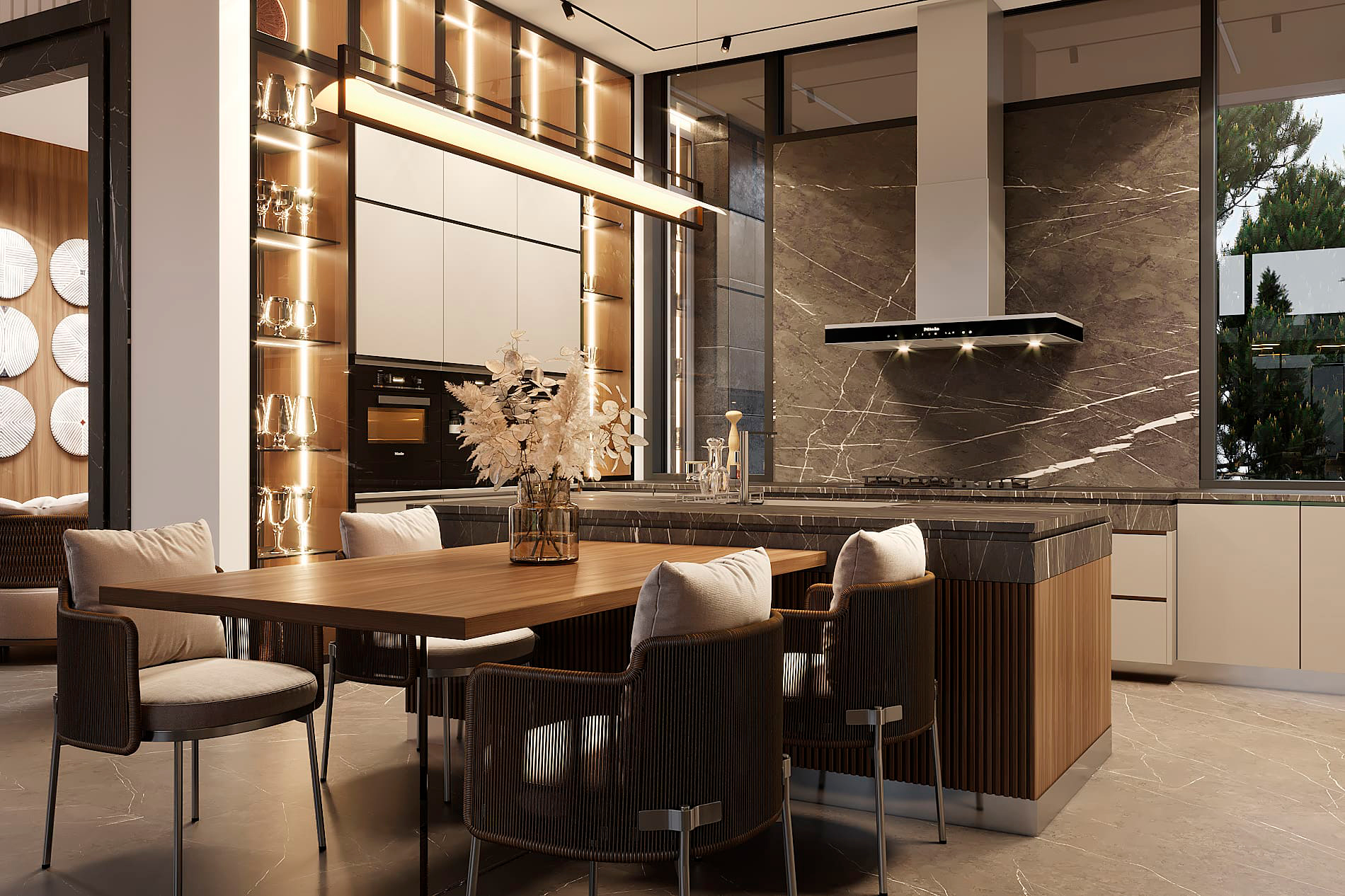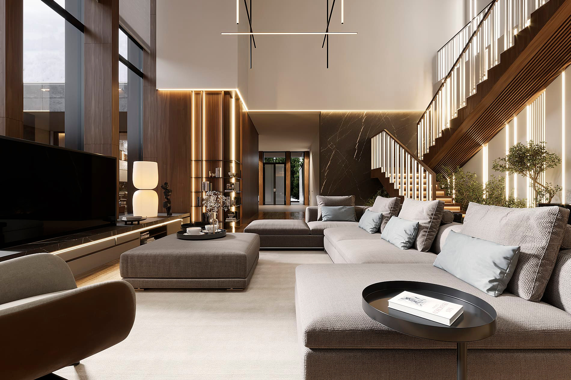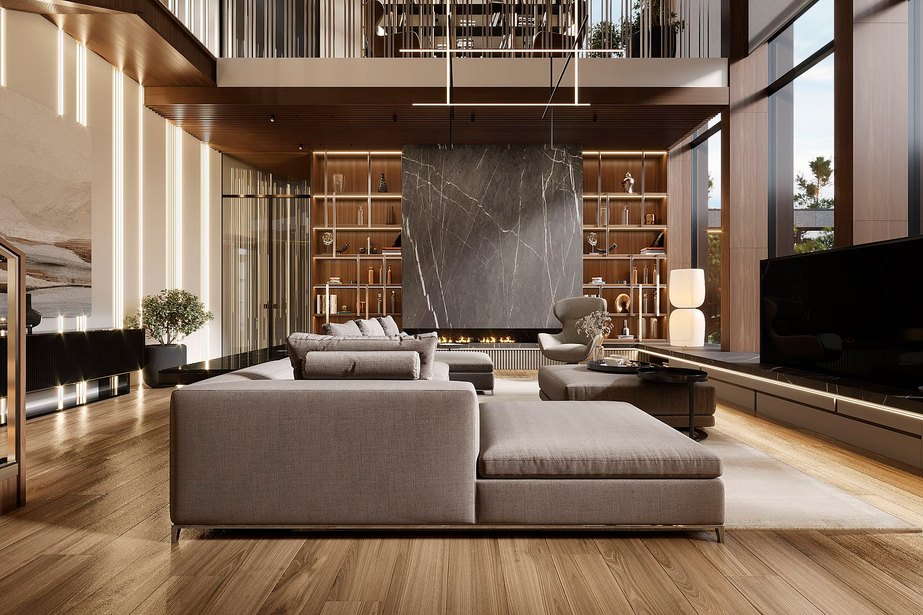 Дом в Охта парке - пространство, где интерьер и природный ландшафт образуют единое целое. Основой для проектирования стало создание неразрывной связи между внутренним пространством и экстерьером. Просторный первый этаж включает двухсветную гостиную, кухню-столовую, мастер-блок и спа-зону.