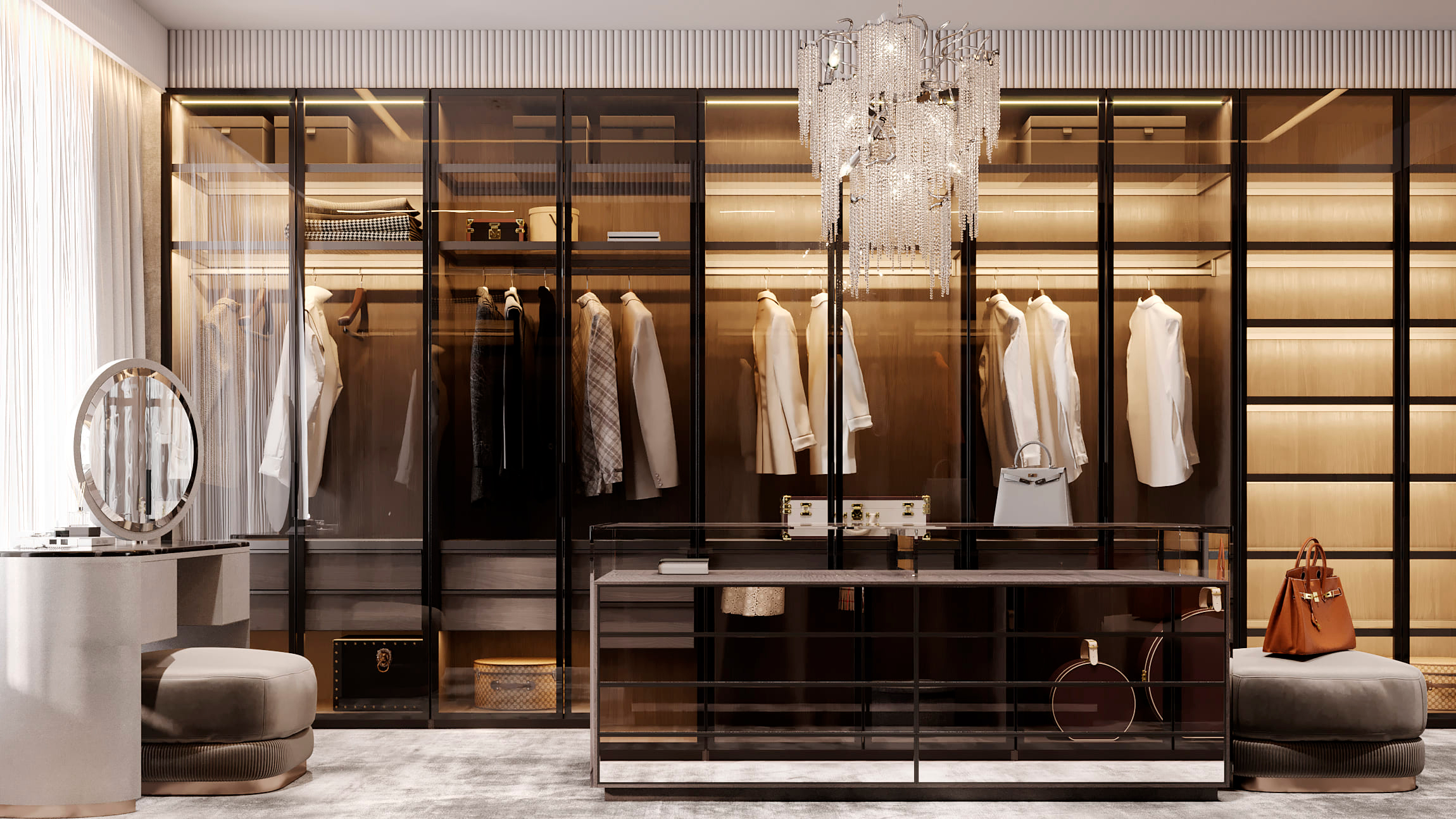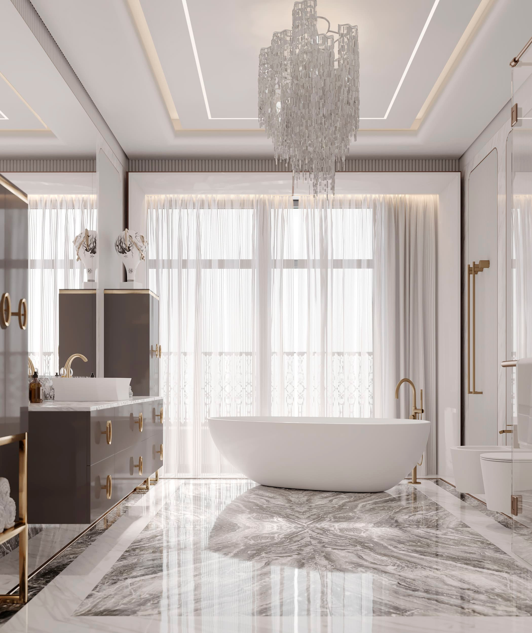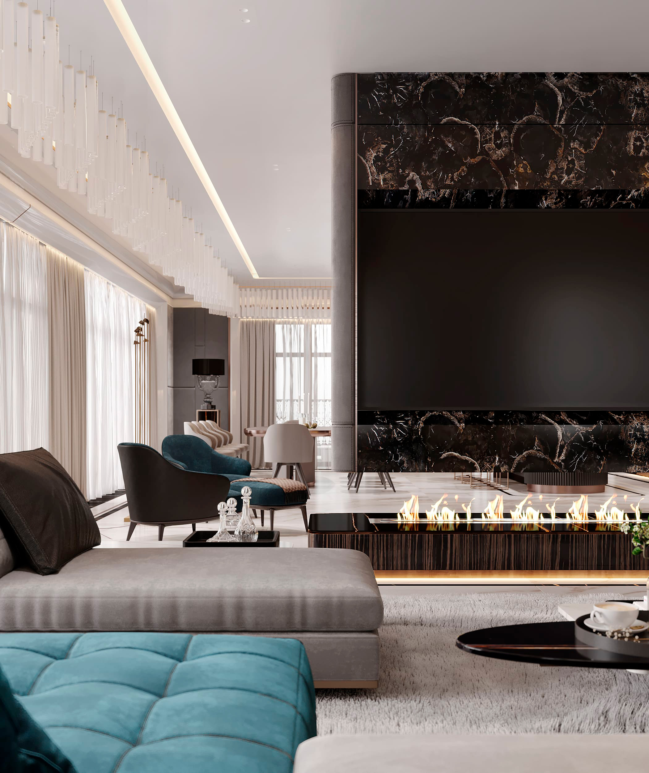 Функционально пентхаус делится на общее пространство столовой-гостиной с панорамным лифтом на крышу и отдельные мастер-блоки для всех членов семьи с гардеробными и ванными комнатами. Терраса на крыше включает спа-зону и гостиную для просмотра кино с собственным джакузи, соляной комнатой и зоной для барбекю.