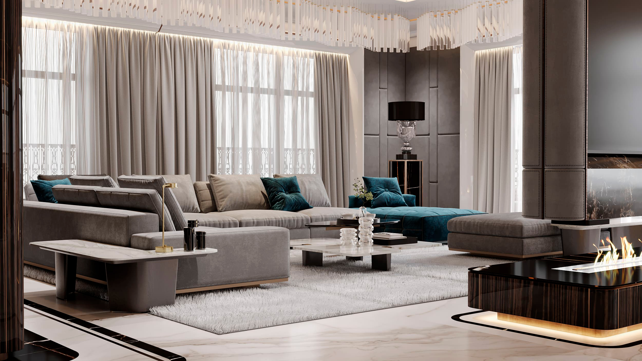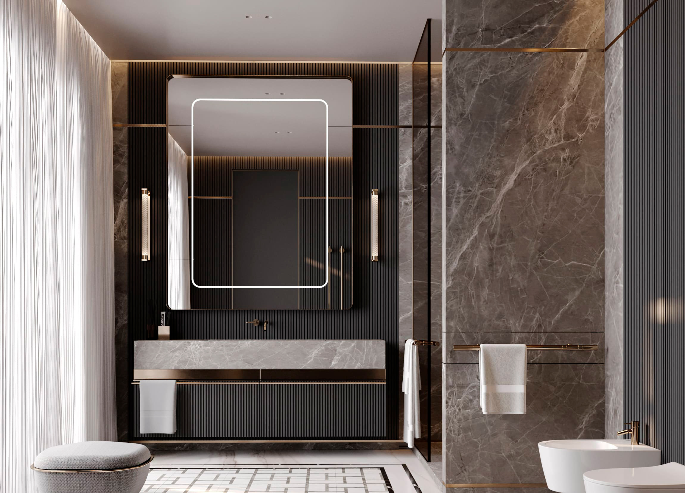 В отделке применены контрастный черно-белый мраморный пол в сочетании с эбеновым шпоном под лаком и панелями из алькантары. Особое внимание уделено деталям и проработке: алькантара дополнена строчкой, в мрамор интегрированы металлические вставки медного сатинированного оттенка, наборный паркет также включает интегрированные вставки из мрамора и металла. Визуально это сложный, многослойный интерьер, где декоративные решения гармонично сочетаются со сложными техническими и эстетическими задачами, успешно воплощенными в жизнь.
