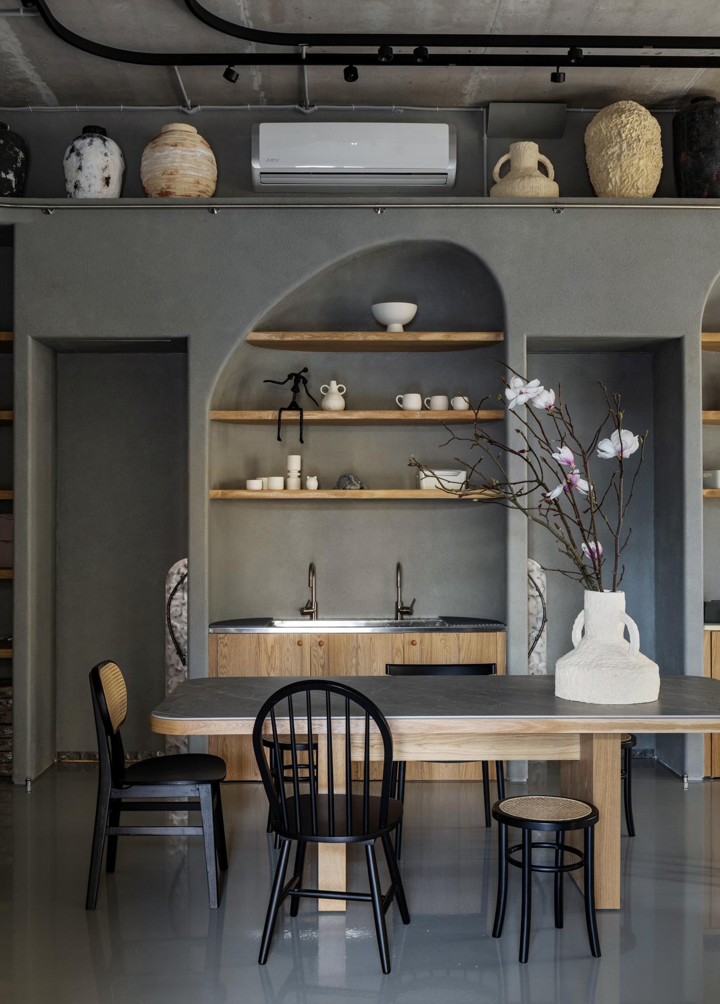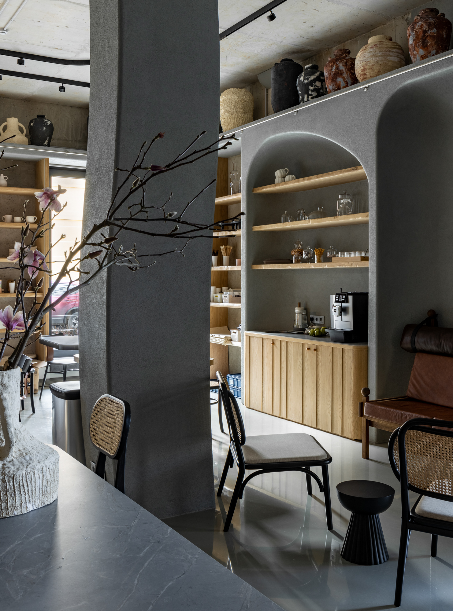 основе концепции проекта лежат мягкие, плавные формы, живые линии и натуральные материалы, позволяющие визуально передать ощущения от древнейшего гончарного ремесла и работы с глиной. Просторные светлые помещения с высокими потолками, залитые мягким дневным светом, проникающим сквозь большие окна, наполнены теплом и уютом. Задача пространства – наполнять людей вдохновением и творческой энергией, позволить замедлить течение времени и наслаждаться созданием красоты.