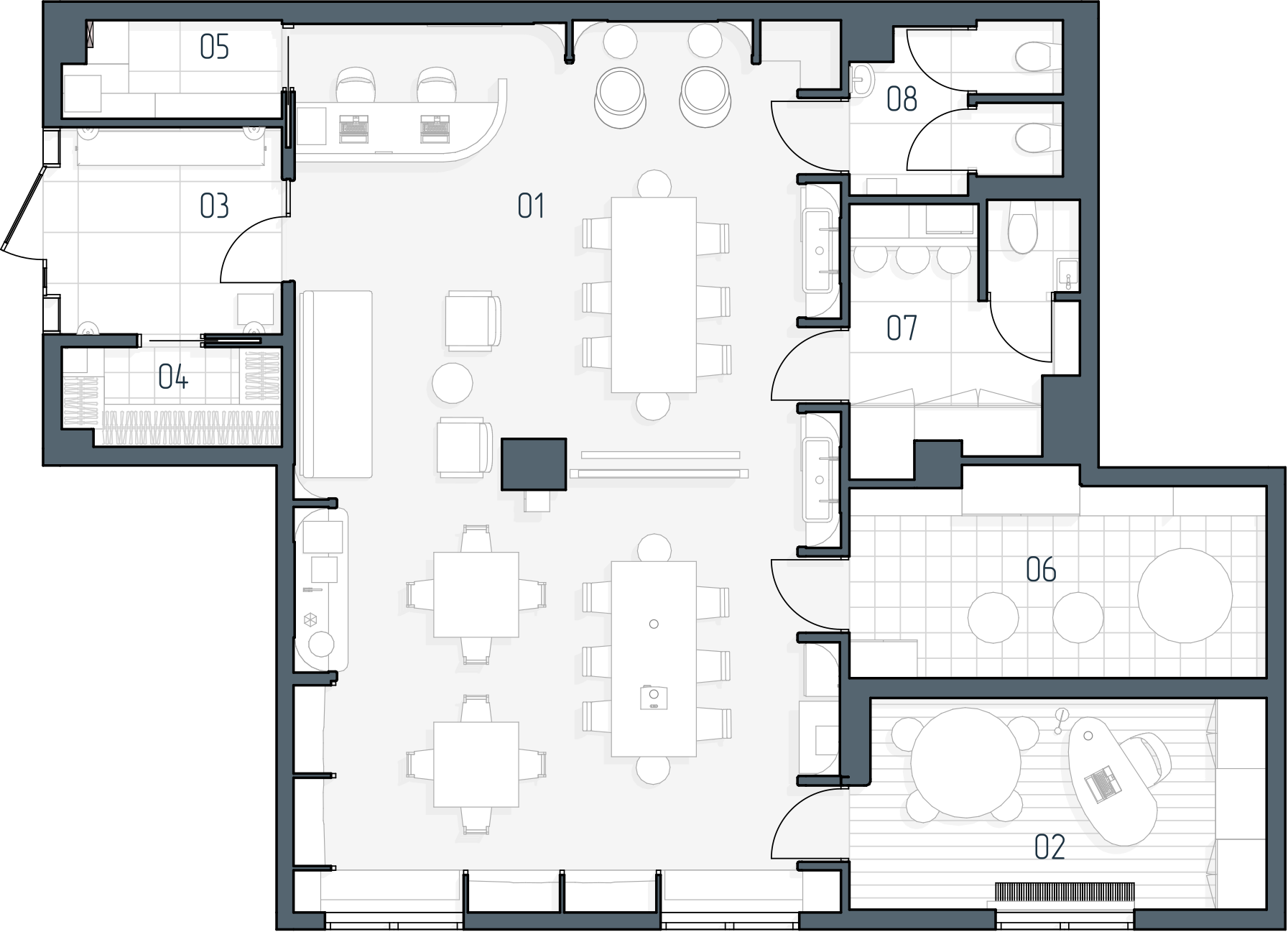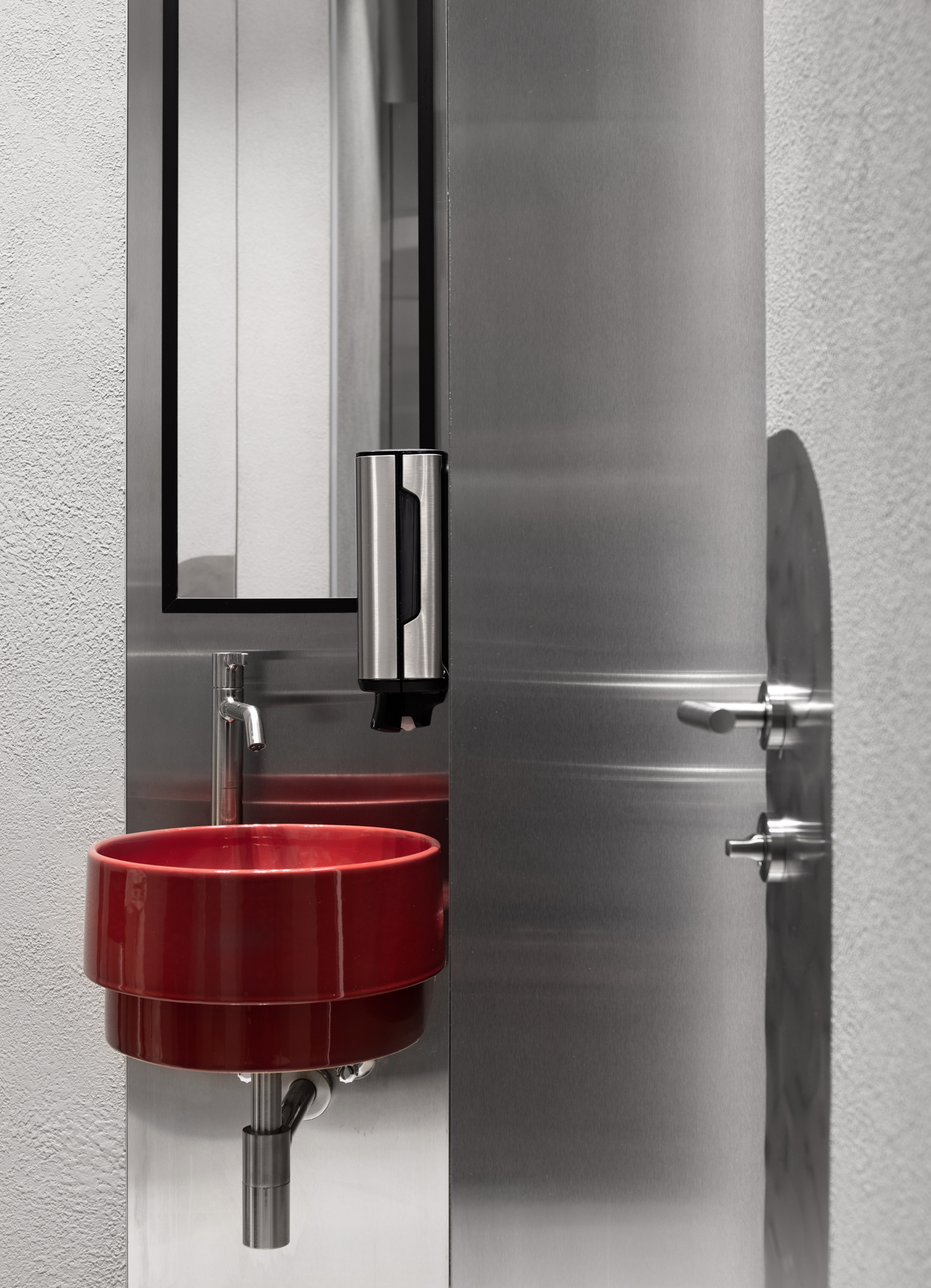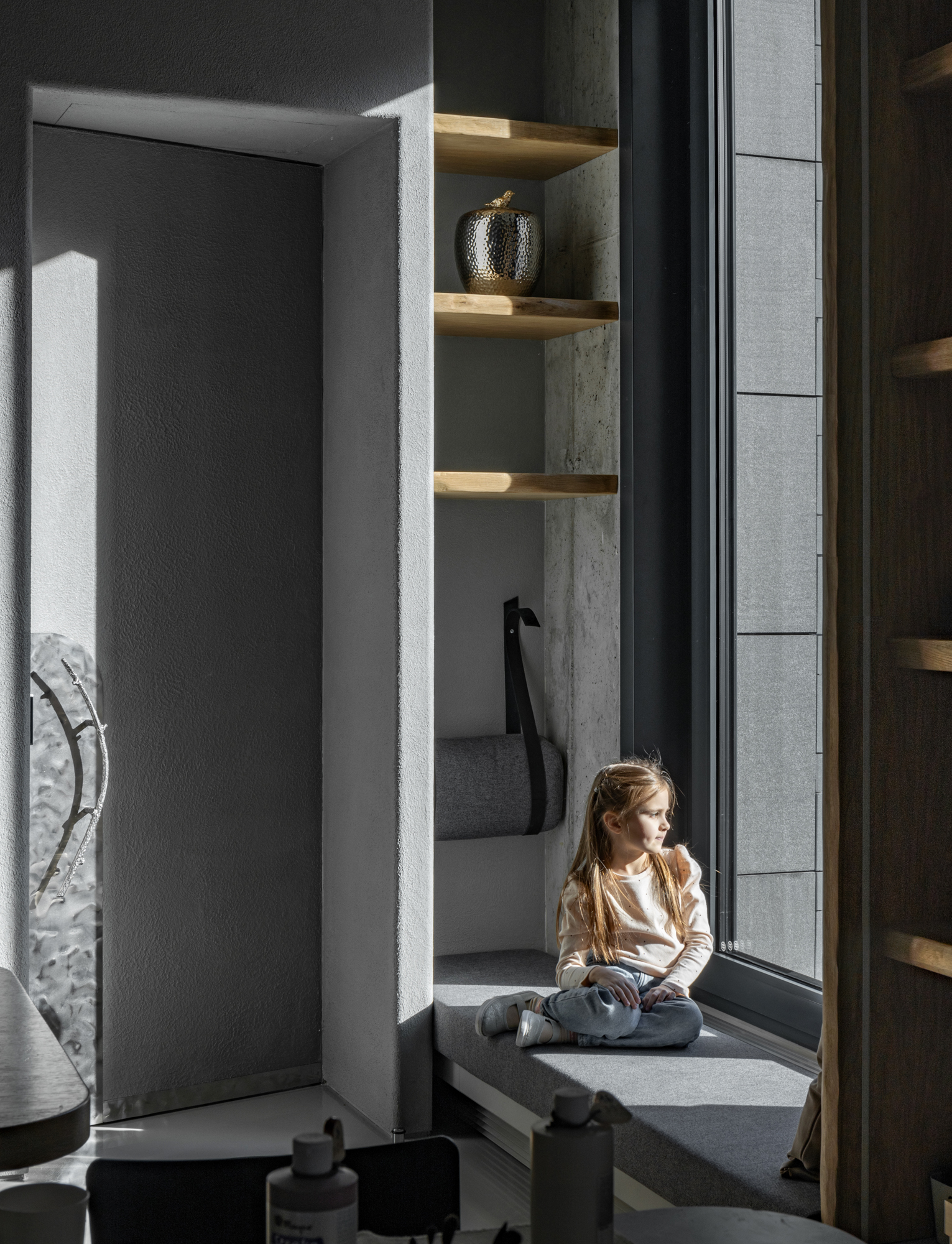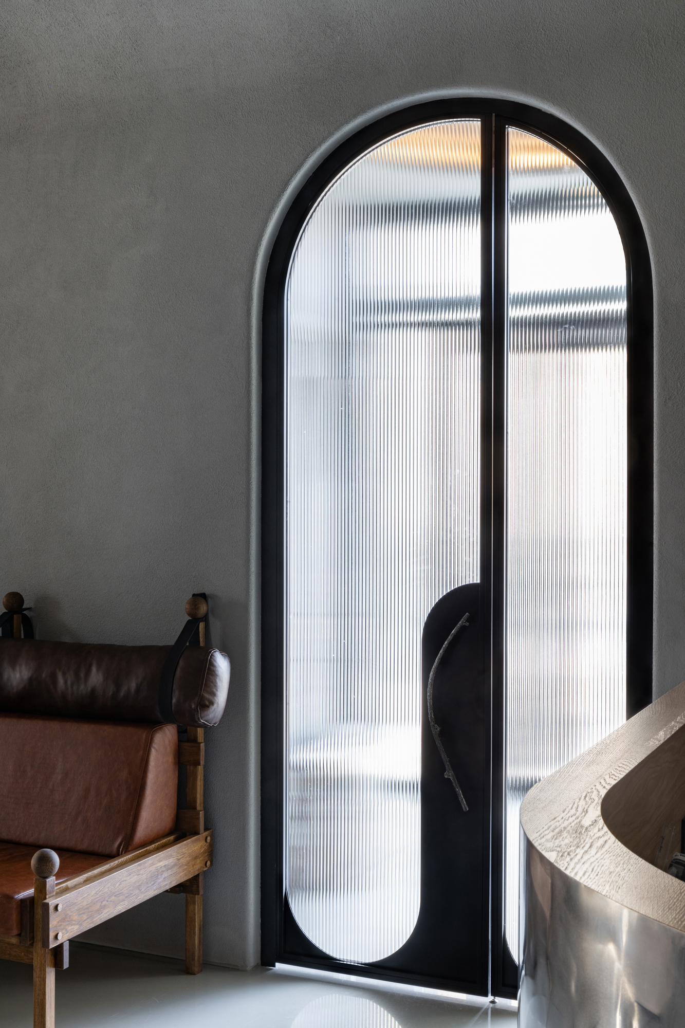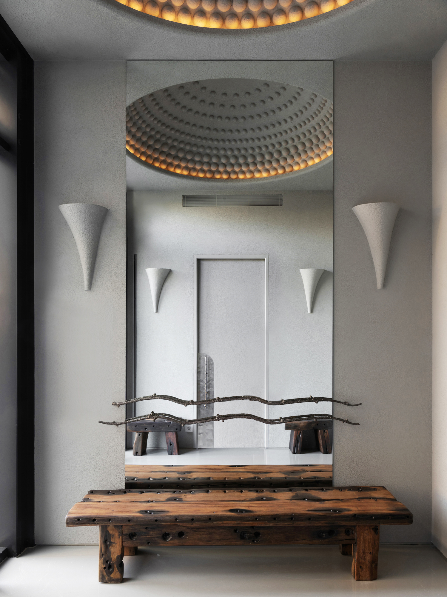 В отделке применены декоративная штукатурка, натуральное дерево с живыми необработанными краями и шлифованная нержавейка. Сохранена эстетика необработанного бетона, оставлены открытыми все коммуникации потолка, а штукатурка выбрана с выраженной фактурой – все для усиления впечатления от работы с природным материалом.