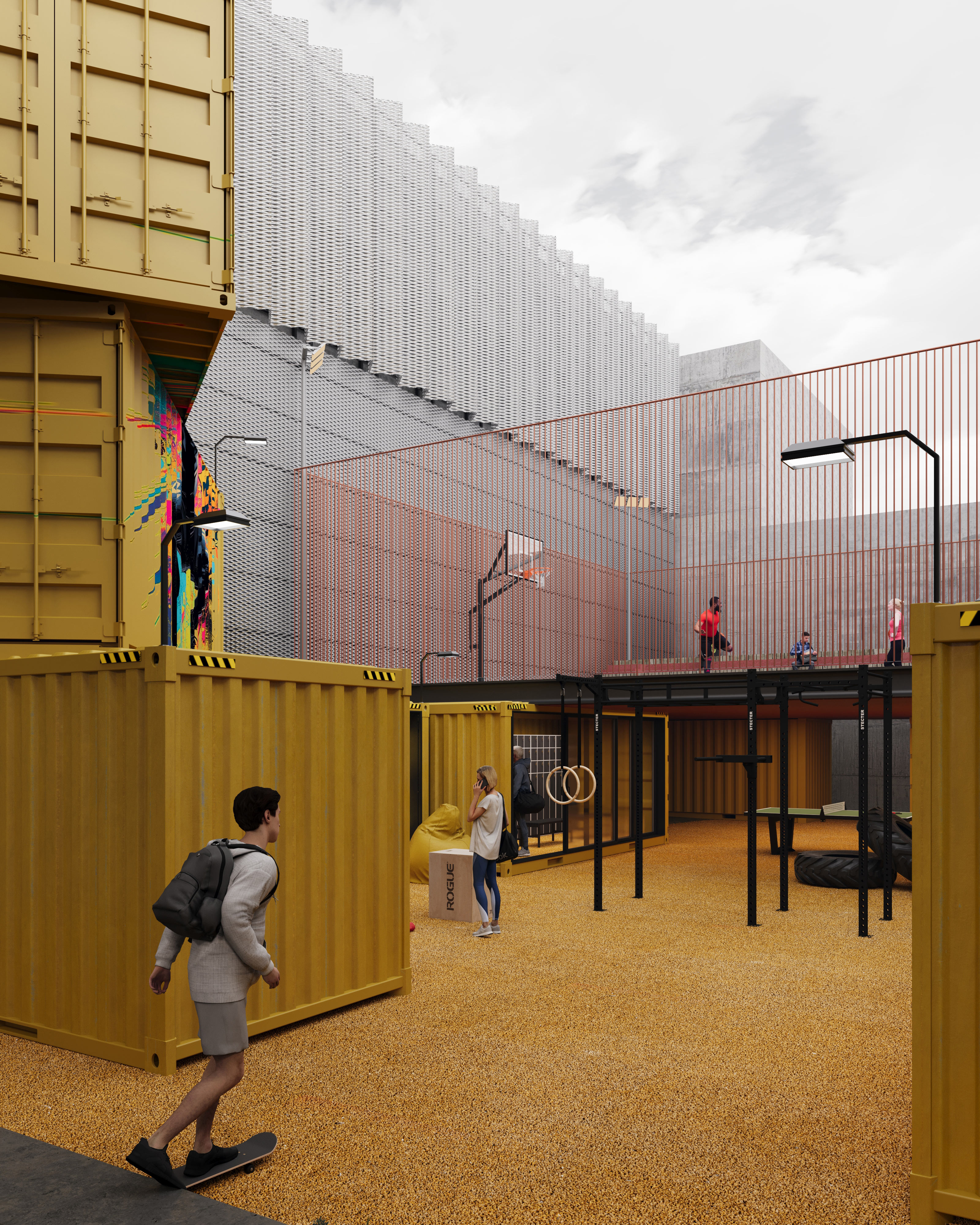 Морские контейнеры выступают в роли гибких модулей для стрит-фуда, поп-ап ритейла и творческих студий, предоставляя резидентам готовую платформу для реализации своих идей и выражения визуального манифеста в рамках кластера. Это не только дань портовому характеру Выборга, но и адаптивная платформа для бизнеса и творчества. Визуальный язык проекта строится на контрасте суровой промышленной палитры и современной архитектурной эстетики. Кортеновская сталь с рыжим оттенком окисленного металла применена в облицовке входной группы и эффектного видового кольца, парящего над основной площадью. Это доминанта, притягивающая взгляд и связывающая пространство воедино. Фасады промышленных корпусов одеты в «кольчугу» из металлической сетки. Она сохраняет объем зданий, придавая им современный технологичный облик.